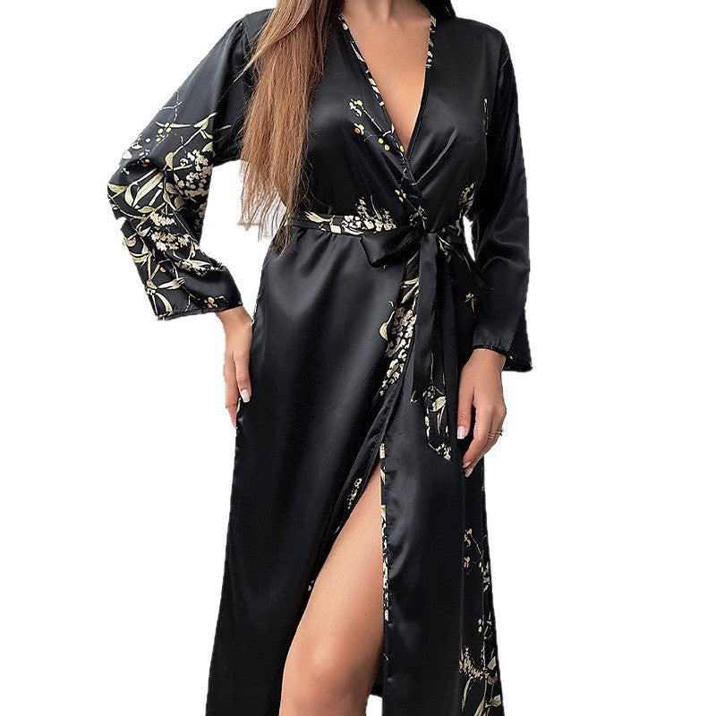 Kiraz desenli sonbahar/kış orta kollu uzun önden bağlamalı sabahlık/gecelik