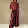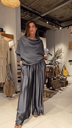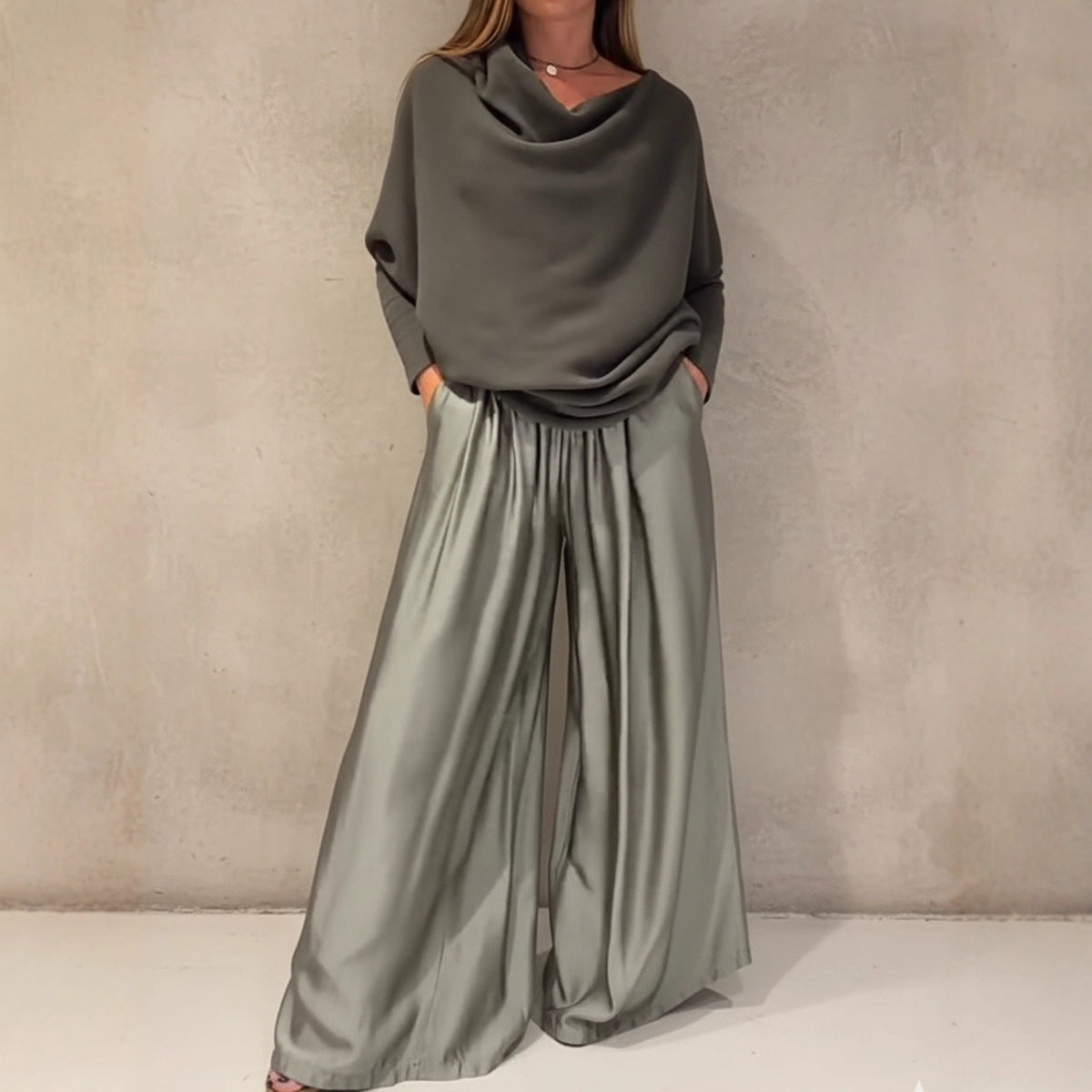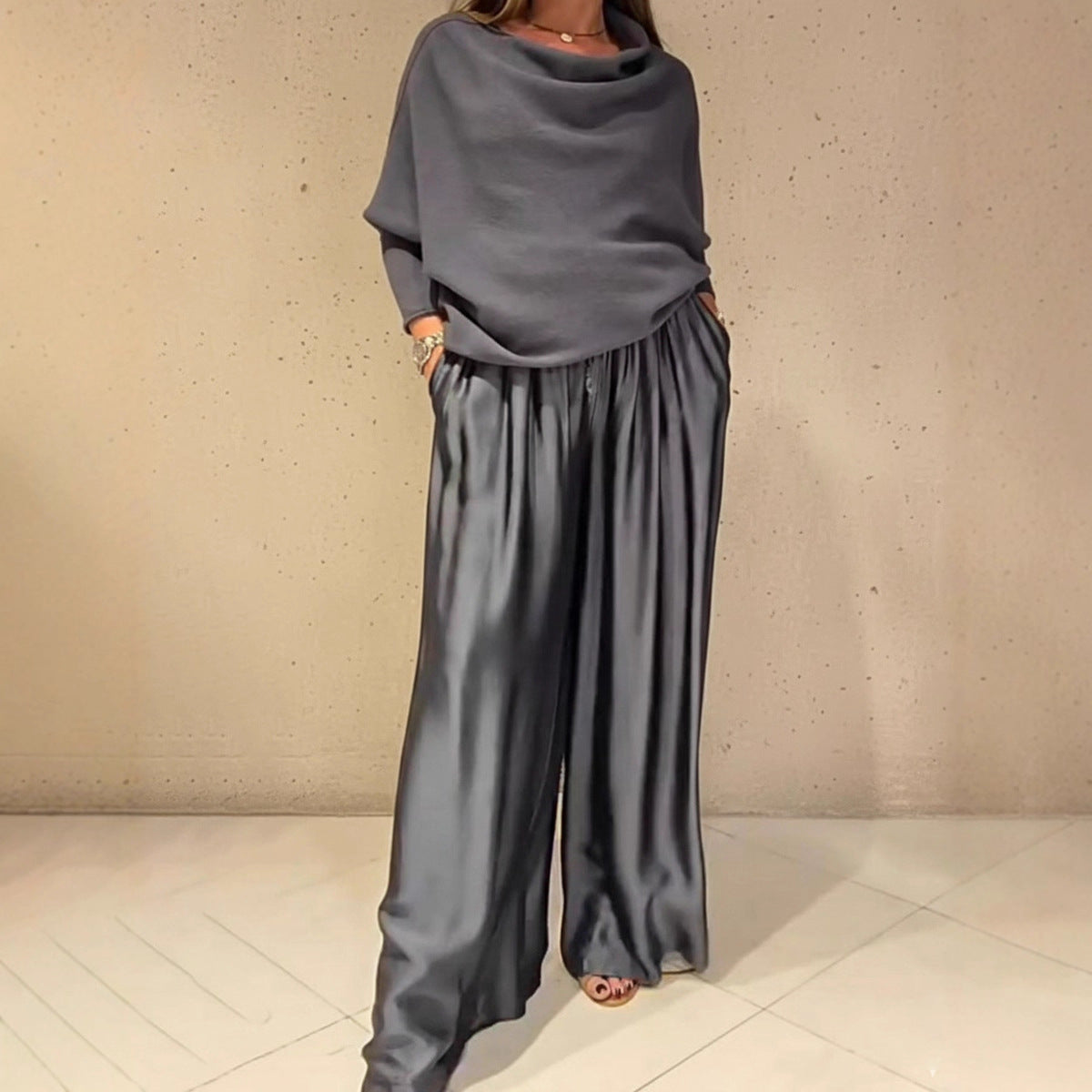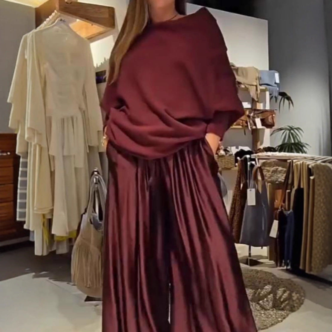 Şık, omuzları açıkta bırakan bir kazak ve saten bol paçalı pantolondan oluşan iki parçalı takım.