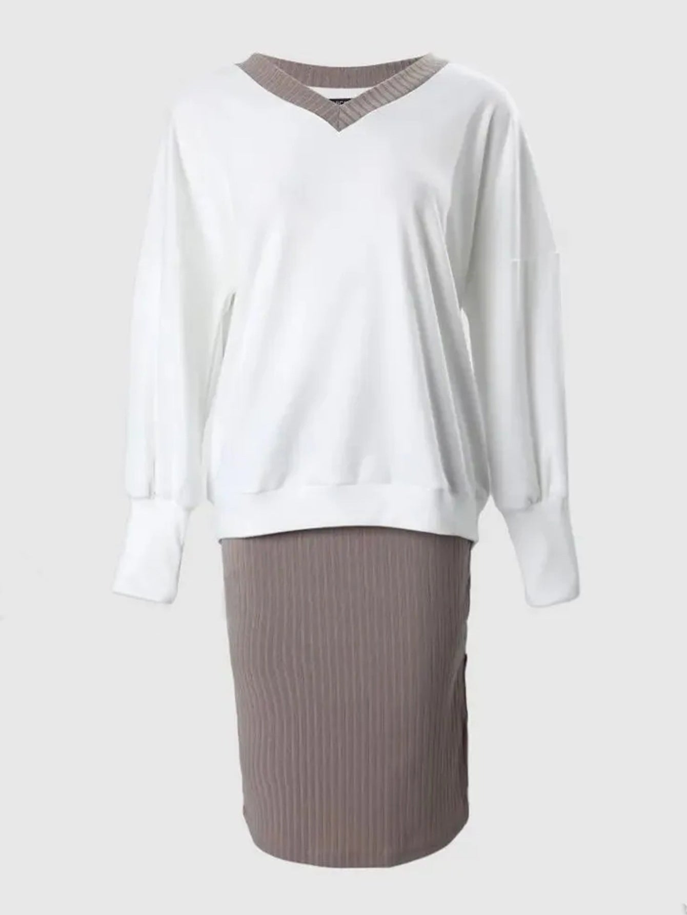 Şık kadın günlük bol kesim V yakalı etek takımı