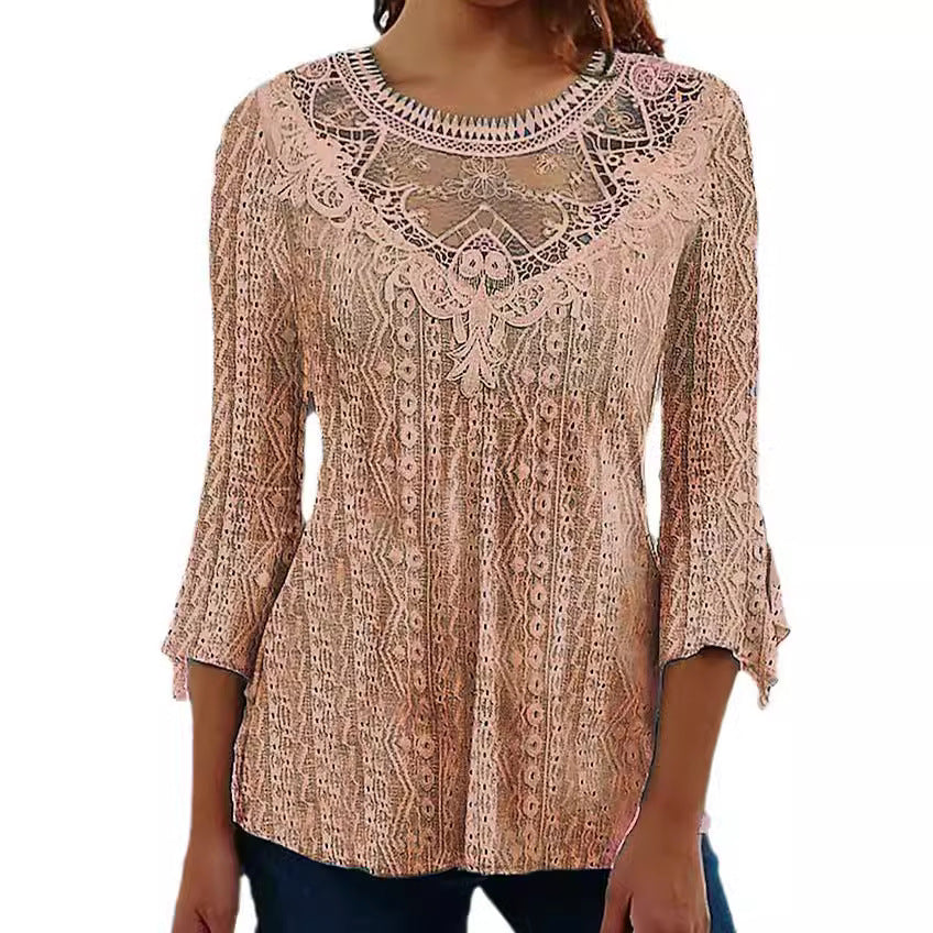 Kadın Dantel Yuvarlak Yaka Kısa Kollu Bluz - Şık Günlük Üst