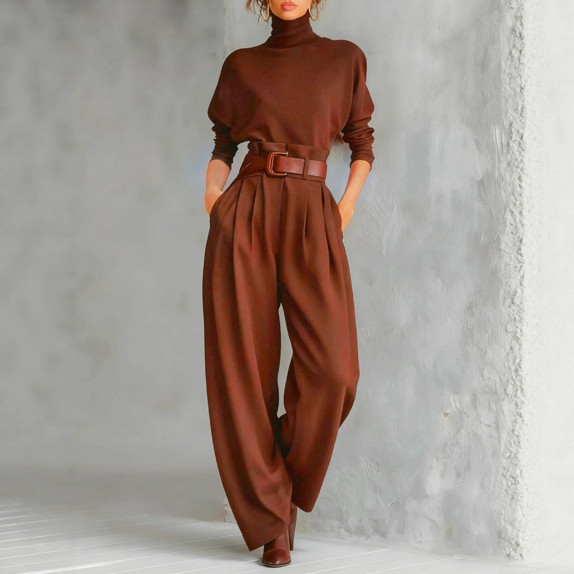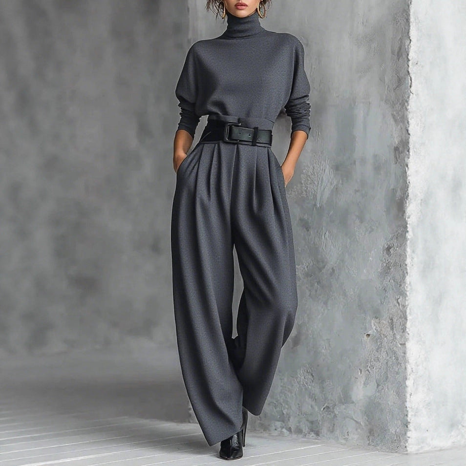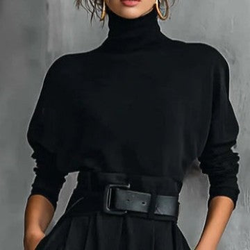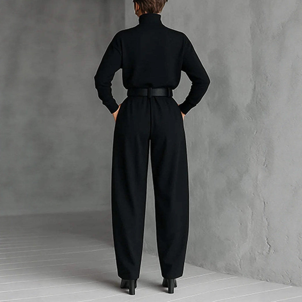 Bu şık, tamamen siyah iki parçalı set, dar balıkçı yaka uzun kollu tişört ve düz paça pantolondan oluşur. Ayrıca şık ve çok yönlü bir görünüm için uyumlu bir kemerle tamamlanır.