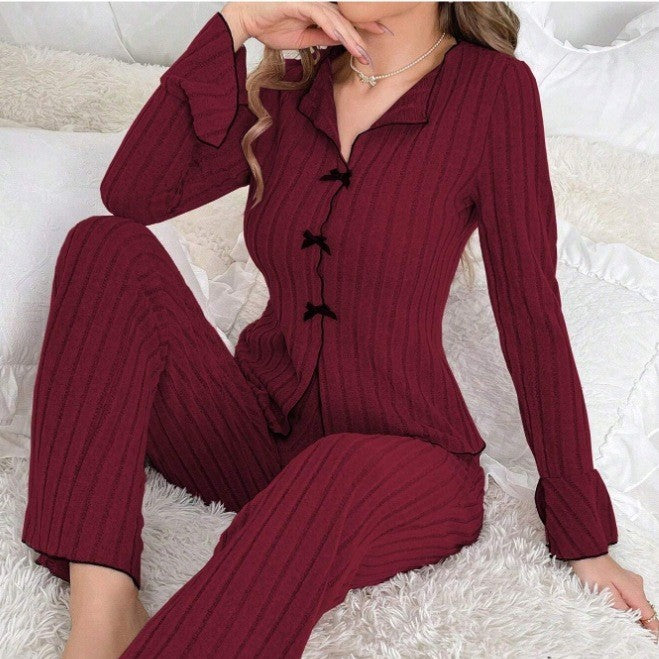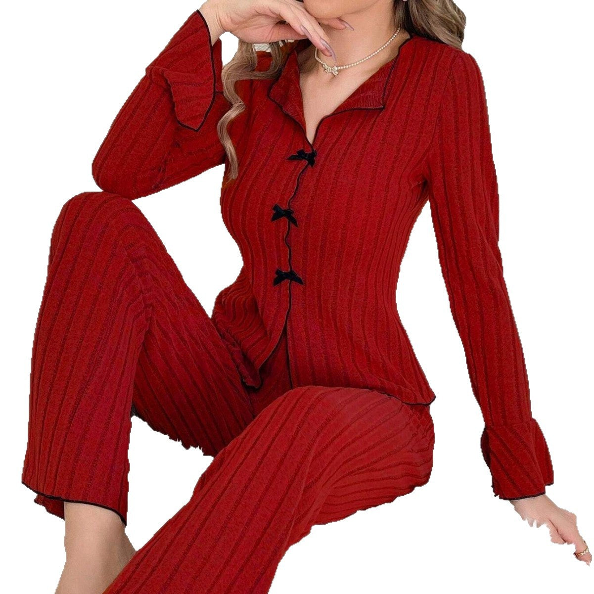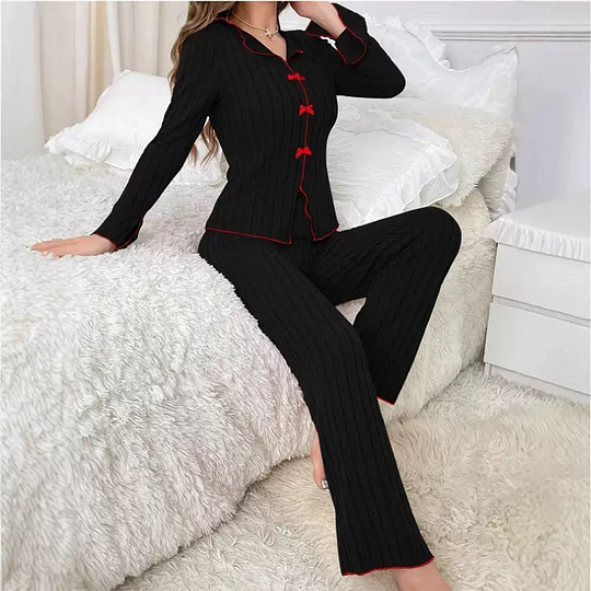 Yaka ve fiyonk detaylı, kadın örgülü pijama takımı.