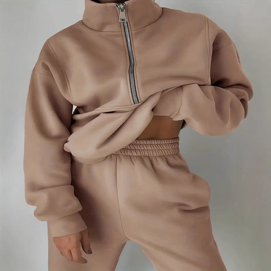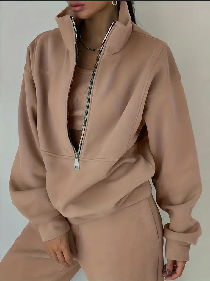 Rahat fermuarlı polar sweatshirt ve eşofman altı iki parçalı kadın giyim