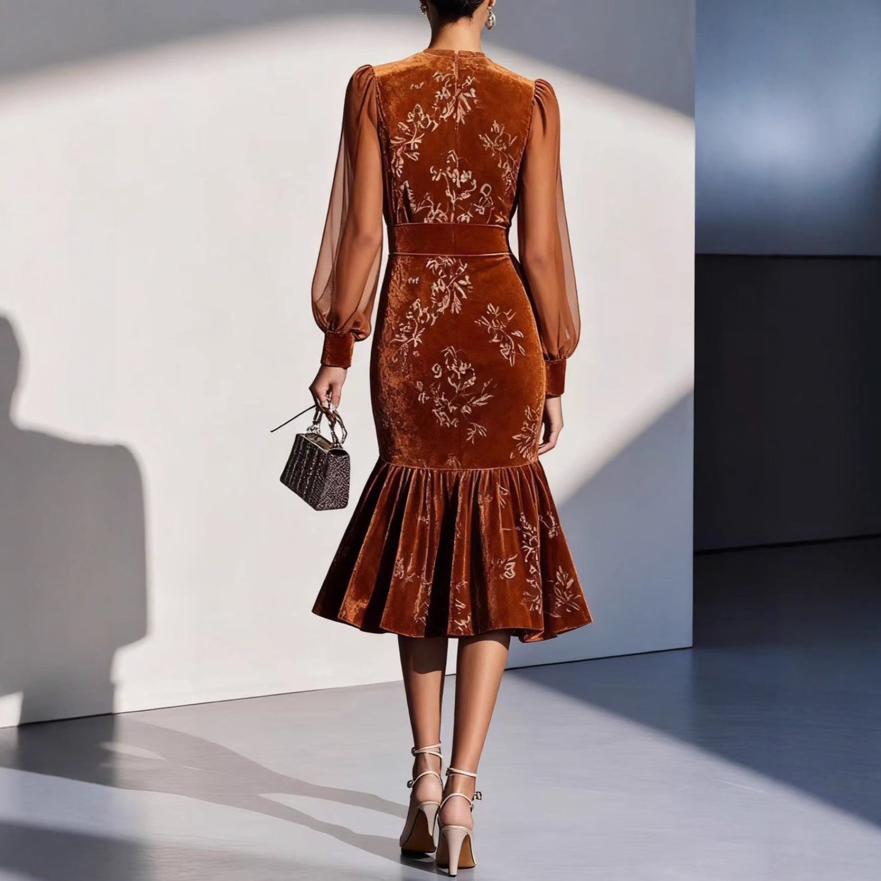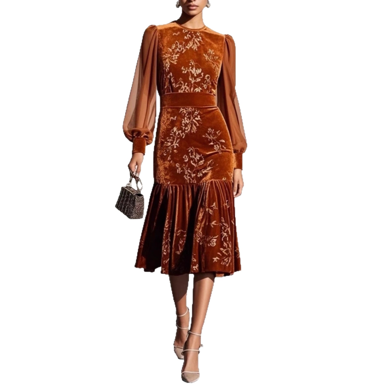 Bu kadife fener kollu elbise, zarif dokusu ve dikkat çekici tasarımıyla şıklığı yeniden tanımlar. Yumuşak kadife kumaşı cilde hoş bir temas sunarken, fener kollu yapısı elbiseye romantik ve modern bir hava katar.