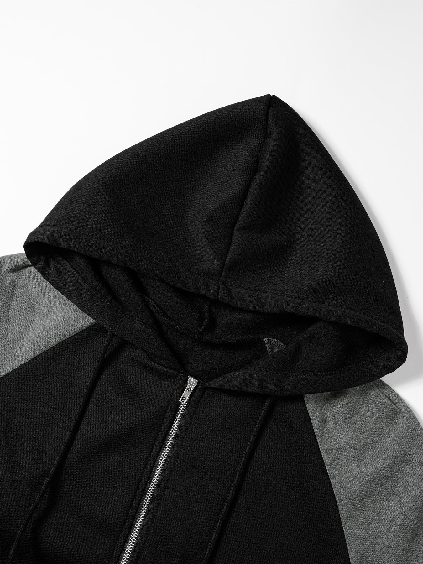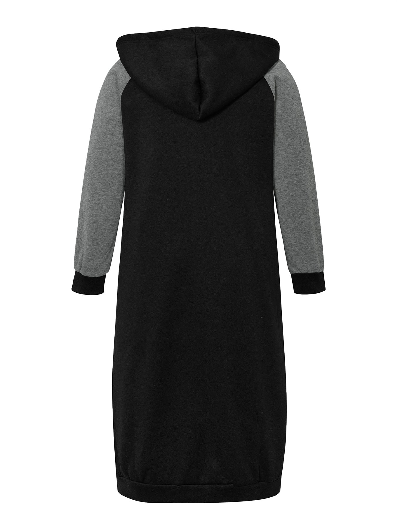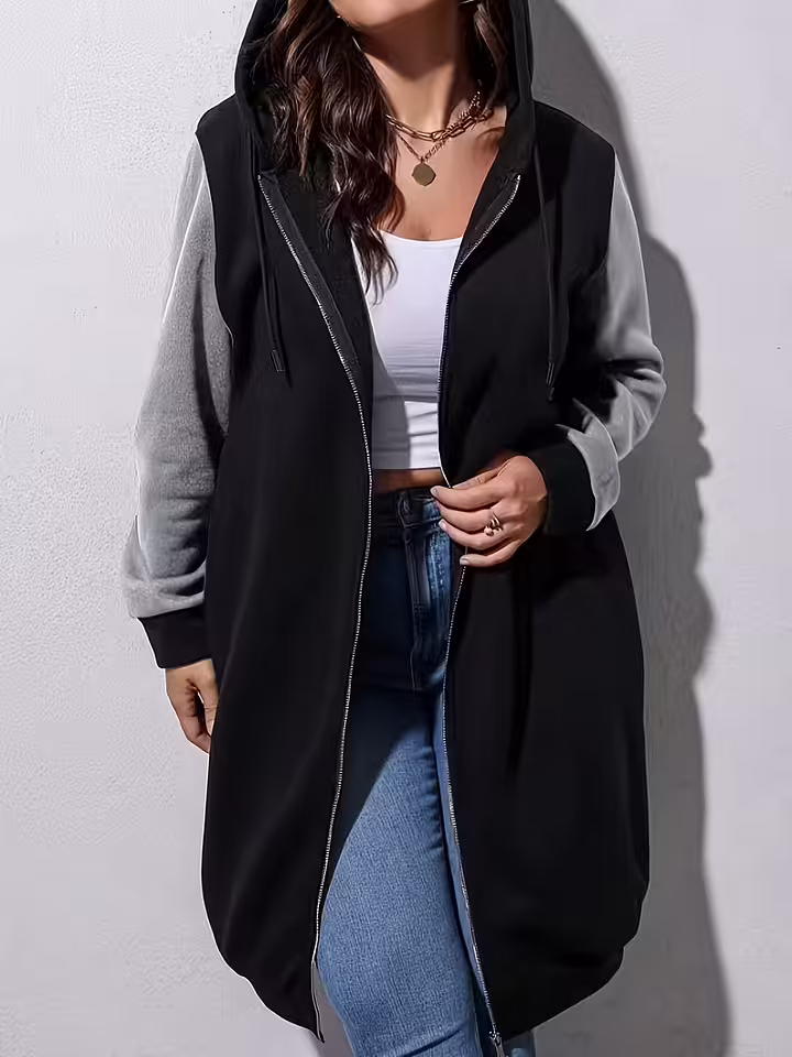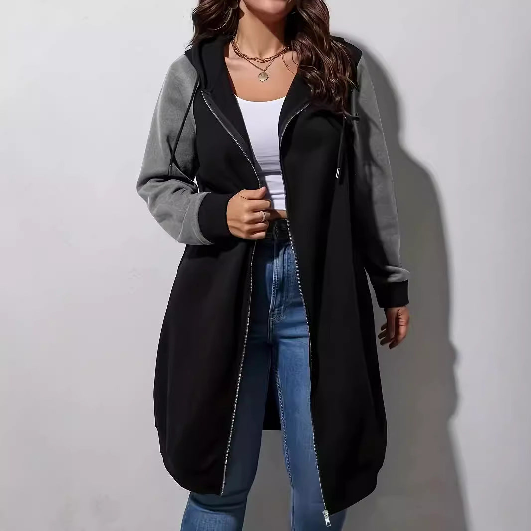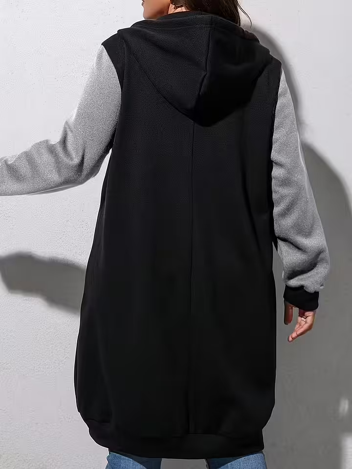Kadın Renk Bloklu Kapüşonlu Fermuarlı Uzun Hırka - Rahat Bol Kesim Sweatshirt Ceket