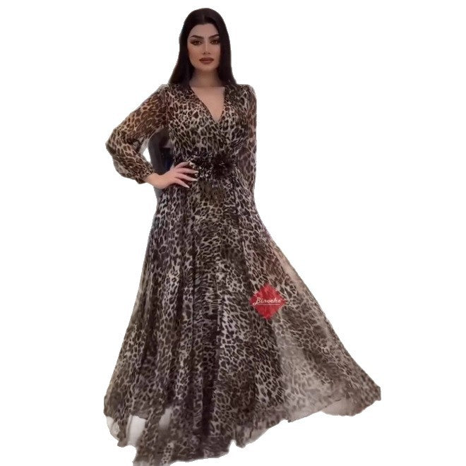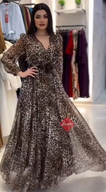 Leopar desenli şık kadın V yakalı elbise