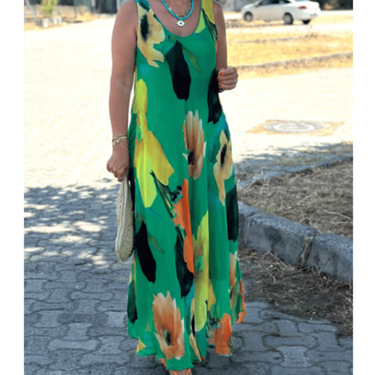 U yakalı çiçek desenli ipek şifon maksi elbise