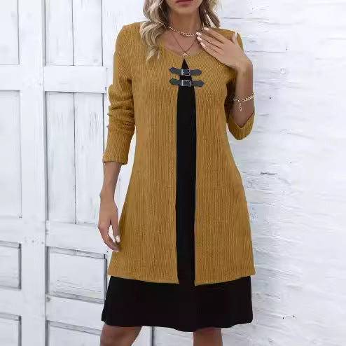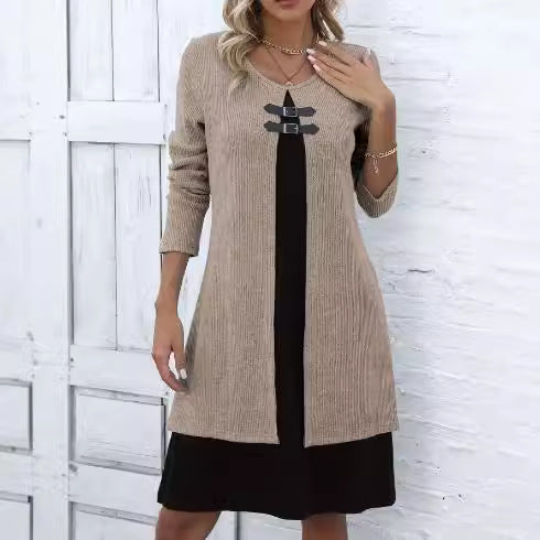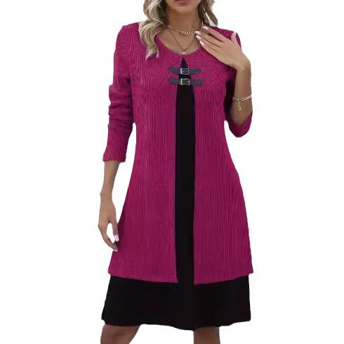 Uzun kollu ve yuvarlak yakalı, şık, iki parçalı kadın elbisesi