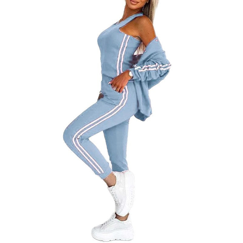 2025 sonbahar/kış spor giyim trendinden ilham alan bu uyumlu üç parçalı set, beyzbol ceketi, sırtı açık atlet ve eşofman altı içeriyor. Konfor ve şıklığı bir araya getiren bu set, bu sezon için mükemmel.