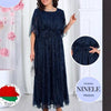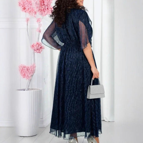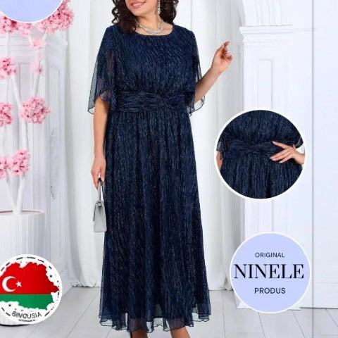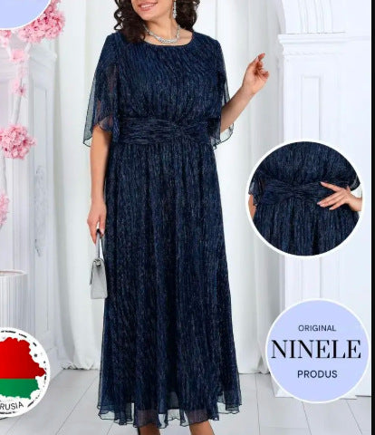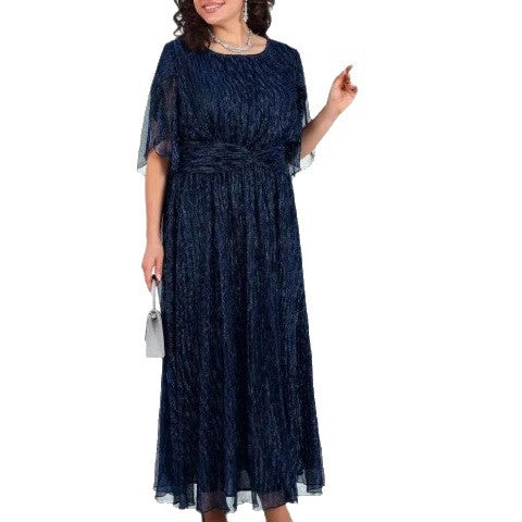 Büyük beden, lacivert midi elbise, simli detayları ve dökümlü pelerin kollarıyla dikkat çekiyor.