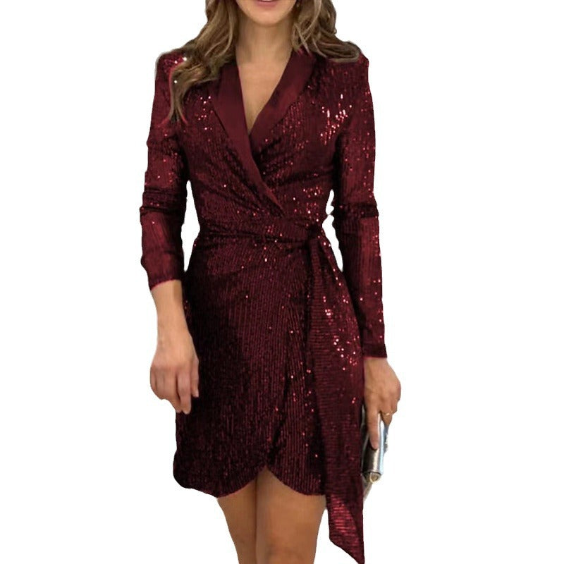 Kadınlar İçin Payetli, Seksi, Düz Renkli, Belden Bağlamalı Elbise