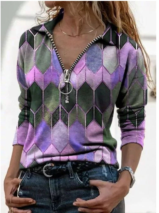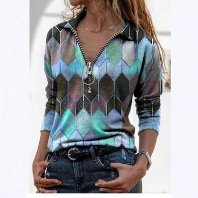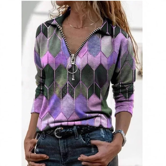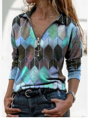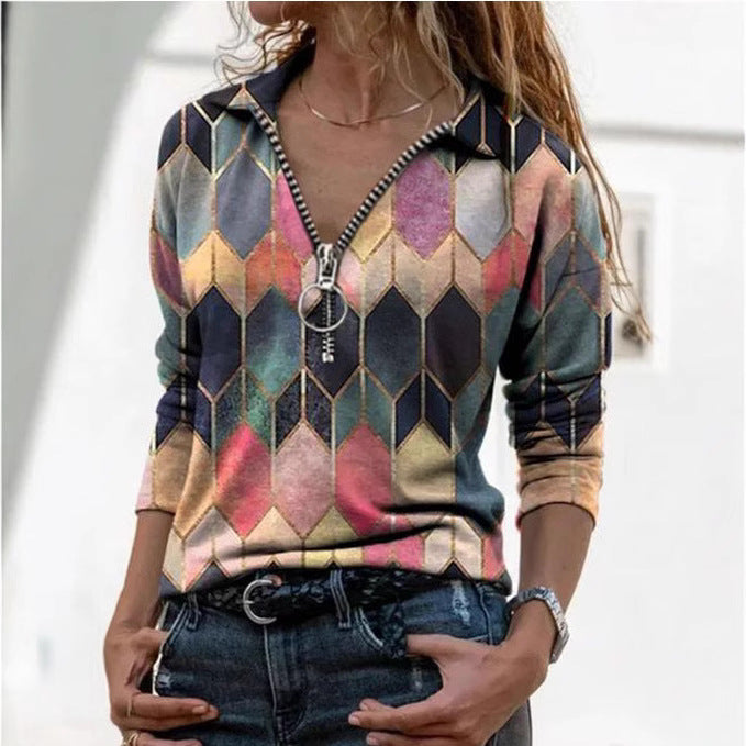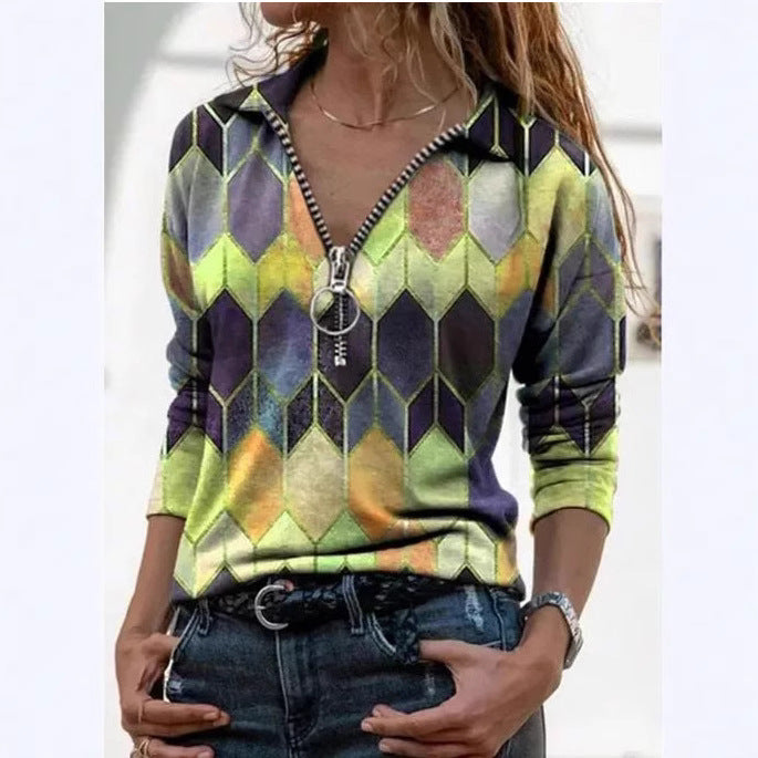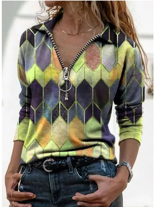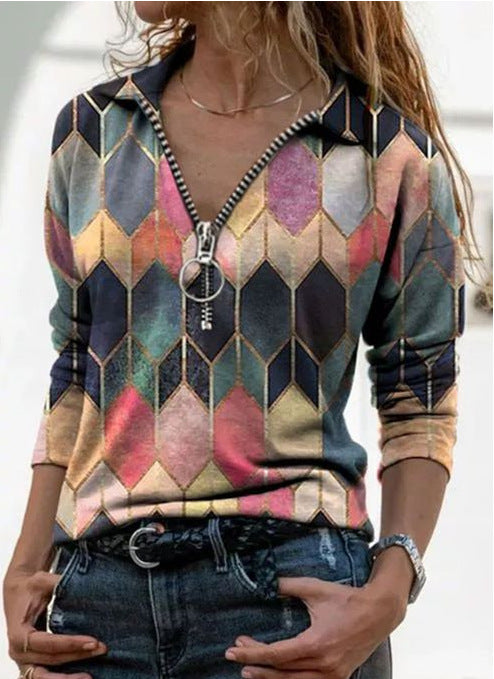 Çok Renkli Geometrik Fermuarlı Uzun Kollu Gömlek