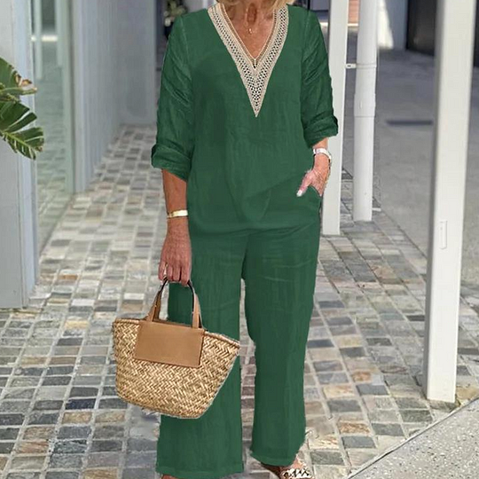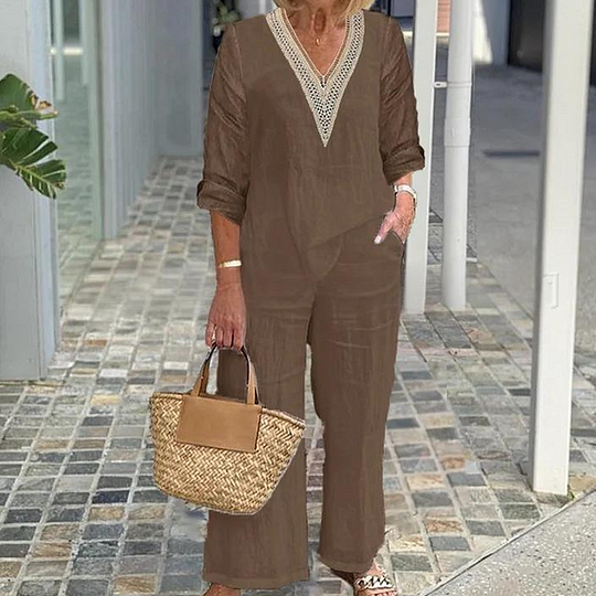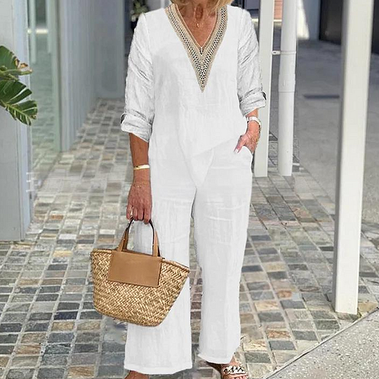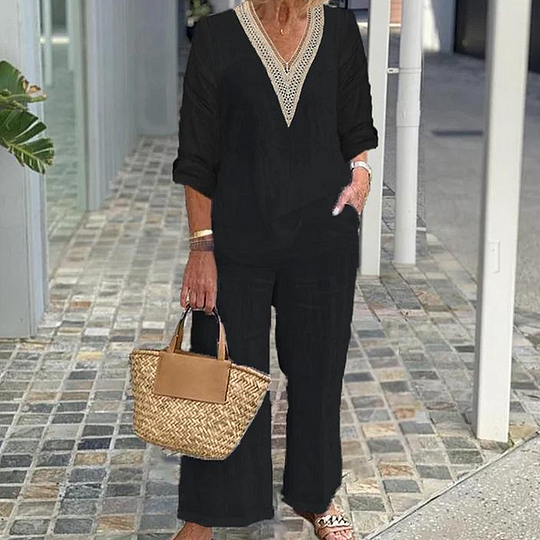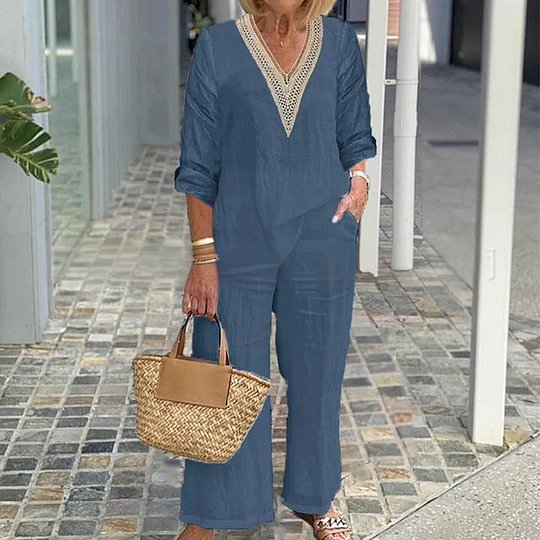 Paket İçeriği: 1 * Kadın V Yaka Üst ve Geniş Paça Pantolon