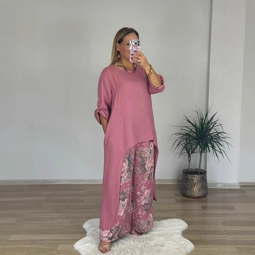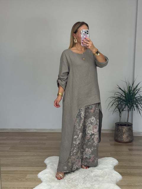 Pamuk ve Ketenden Günlük Düzensiz Üst ve Geniş Paça Pantolon Takımı