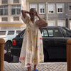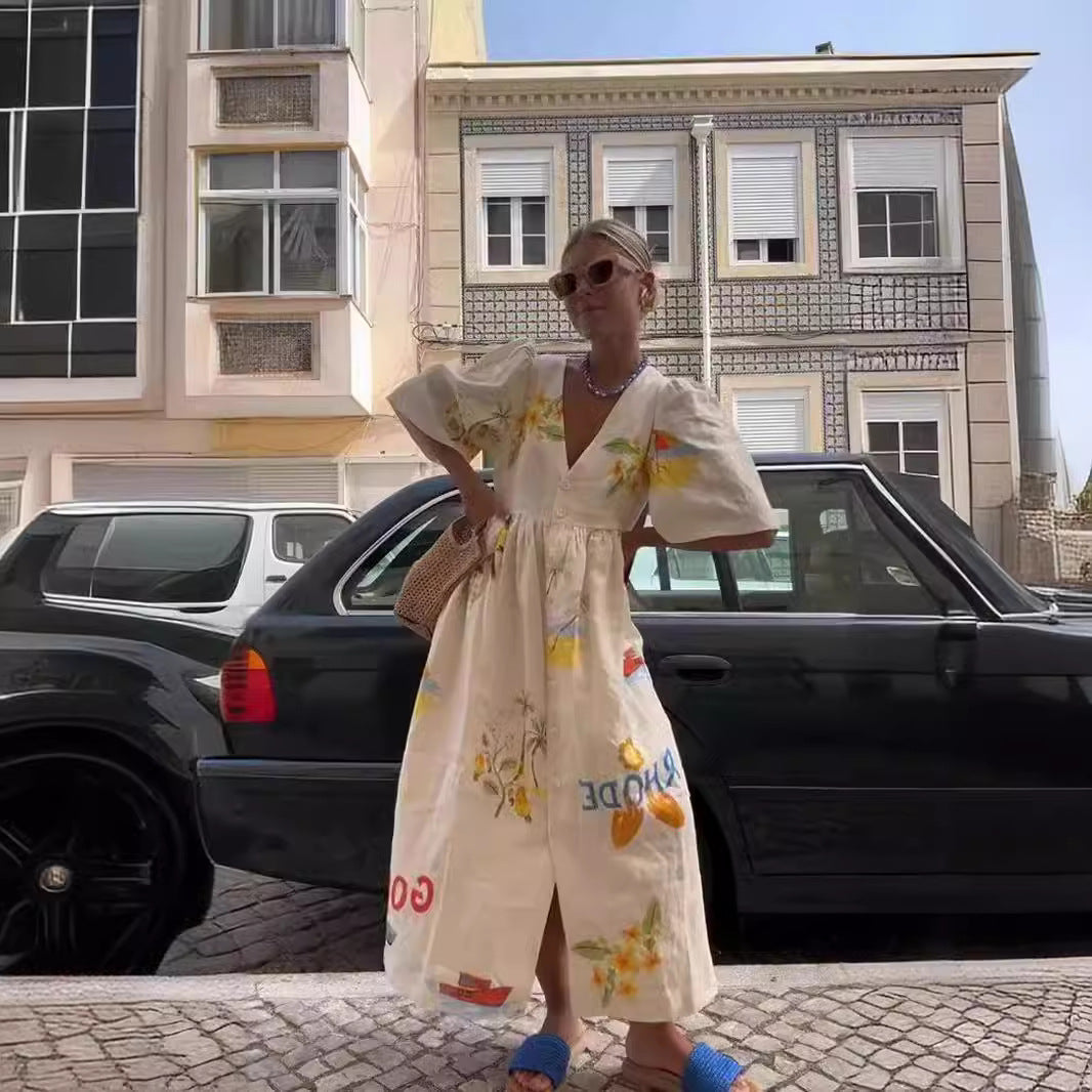 Pamuk ve ketenden yapılmış, baskılı, kısa kollu, V yakalı kadın elbisesi