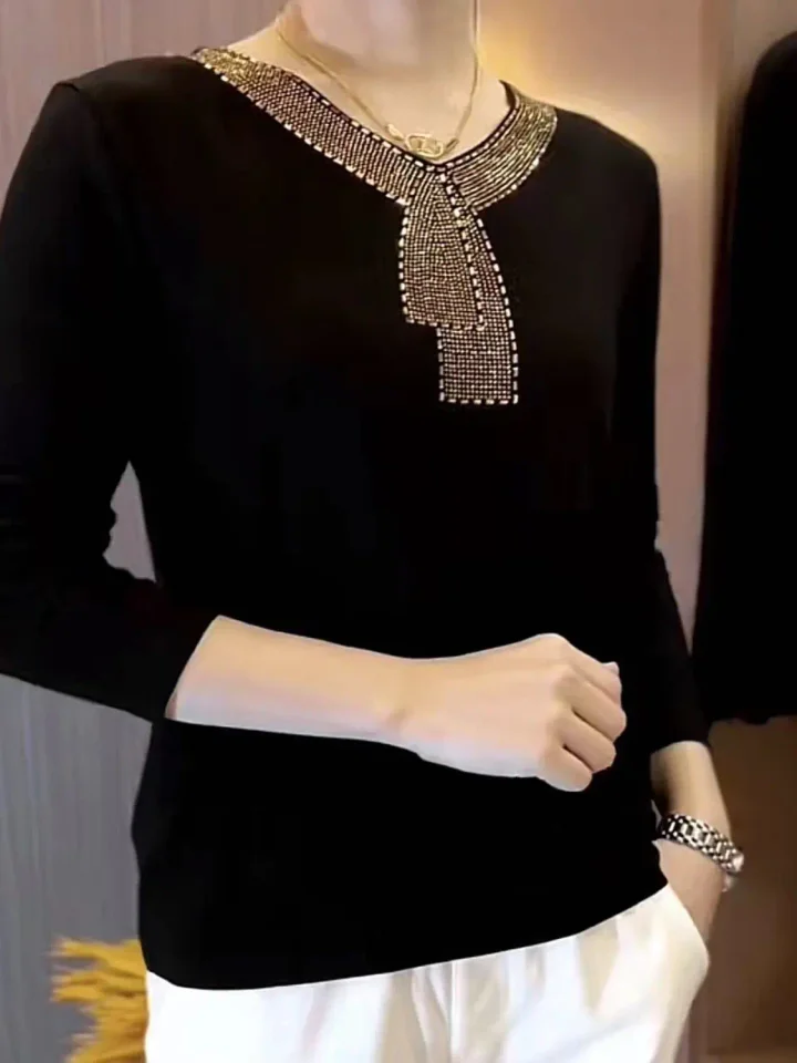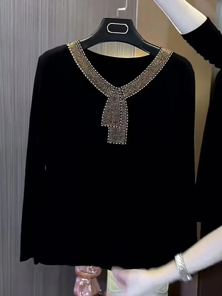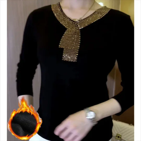 [XL-6XL] 2025 Yüksek kaliteli kışlık uzun kollu kadife tişört, yapay elmaslarla süslenmiş