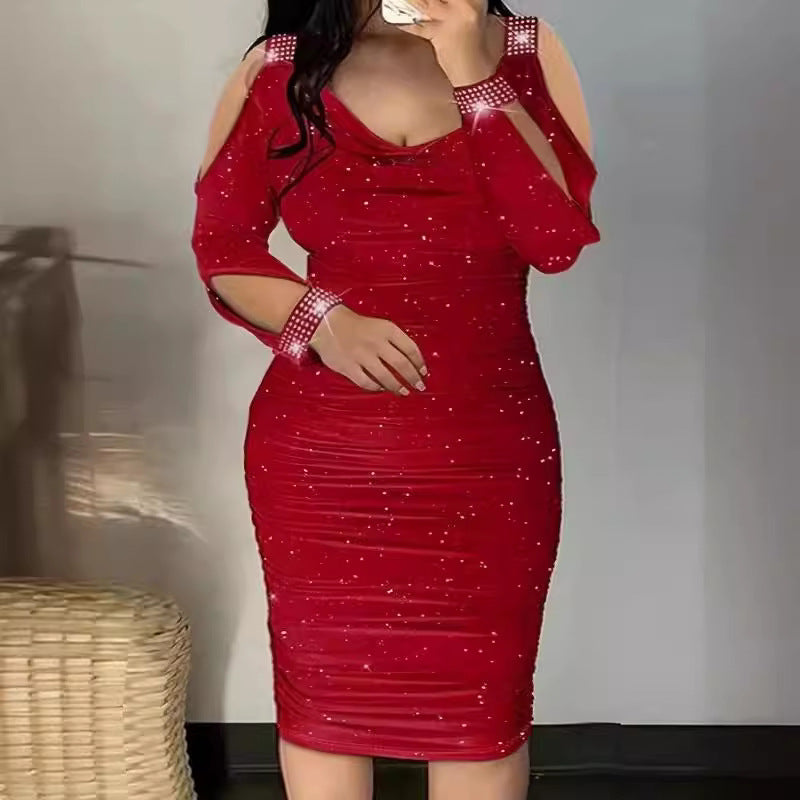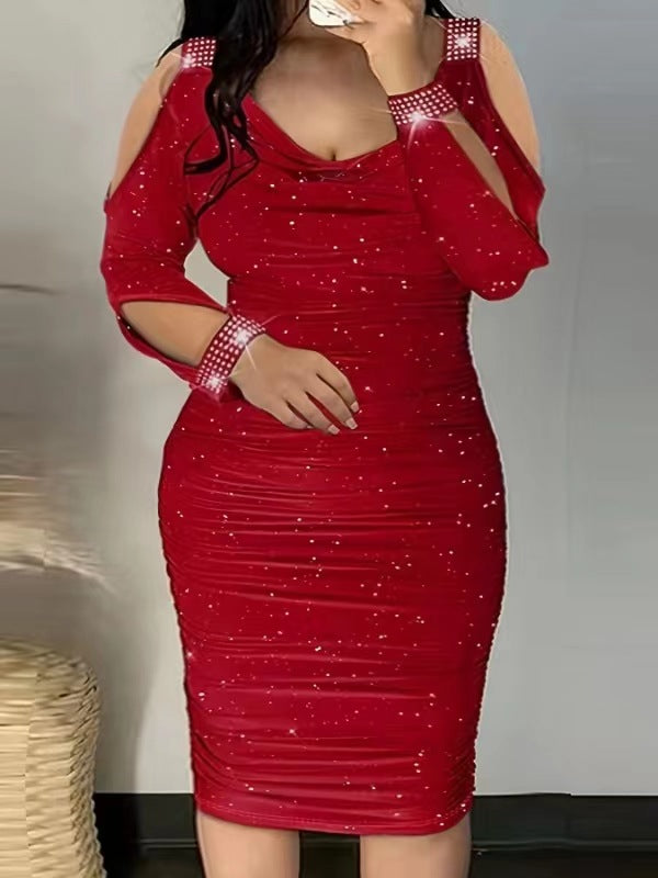 Kırmızı yapay elmaslar ve balon kollu, ışıltılı vücuda oturan elbise