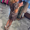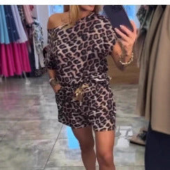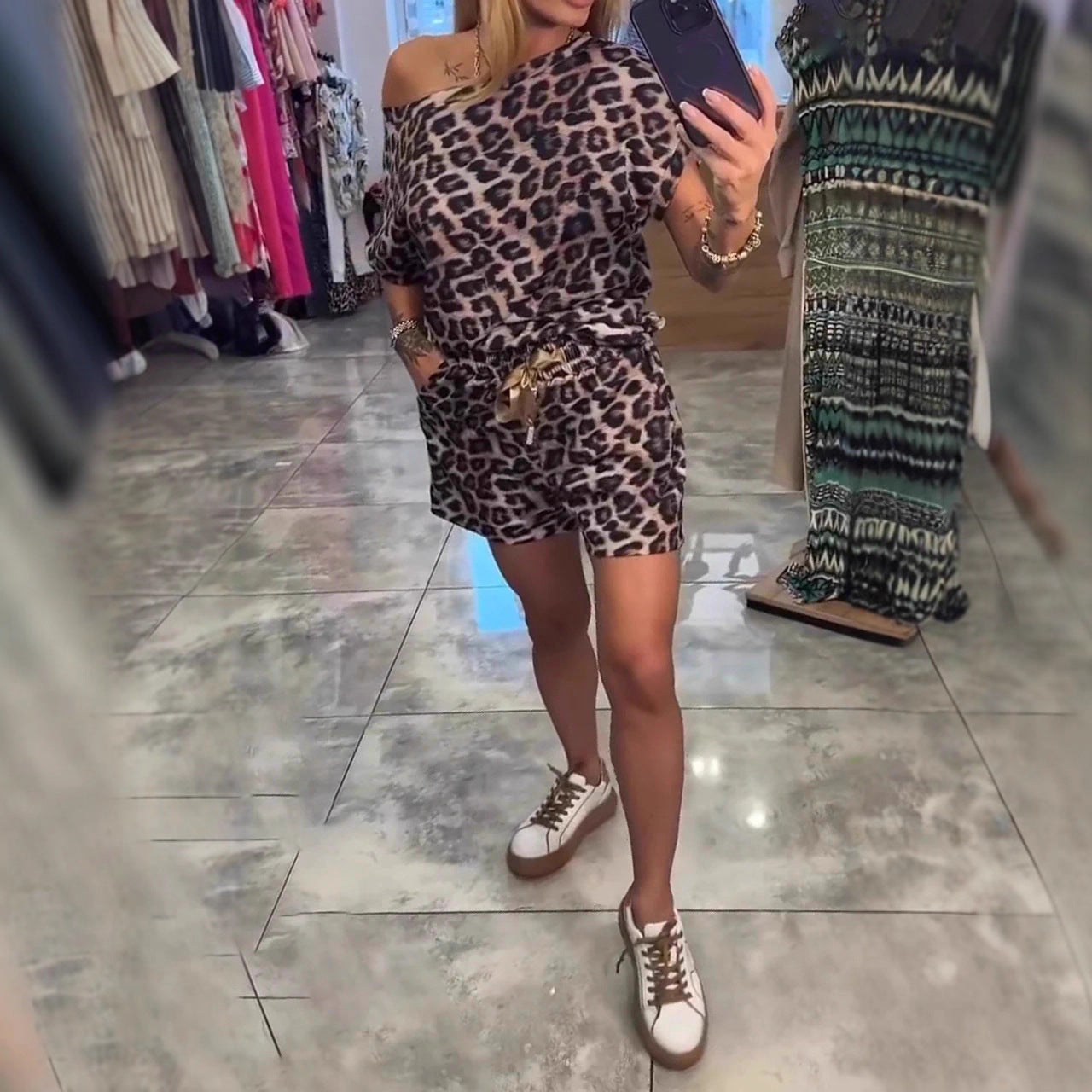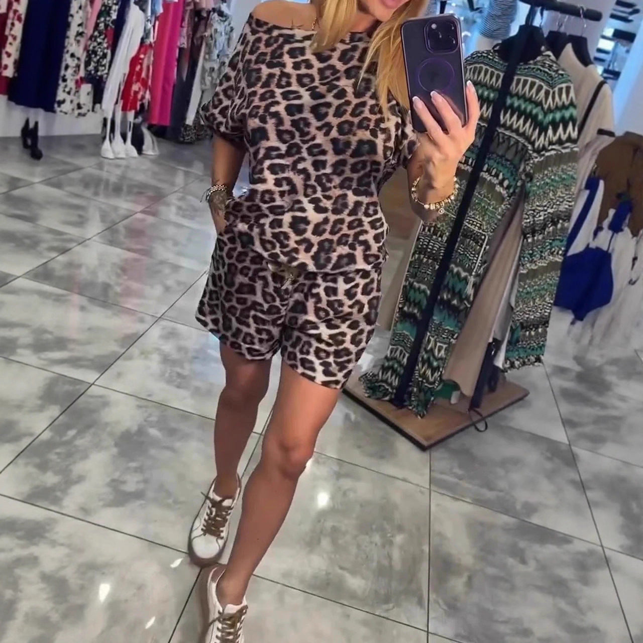 Kadın Leopar Desenli Eğimli Yaka Tişört + Şort Günlük Takım