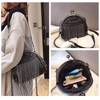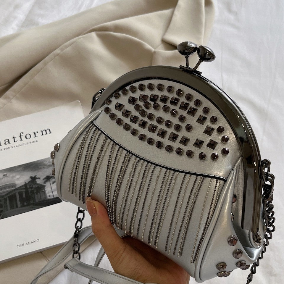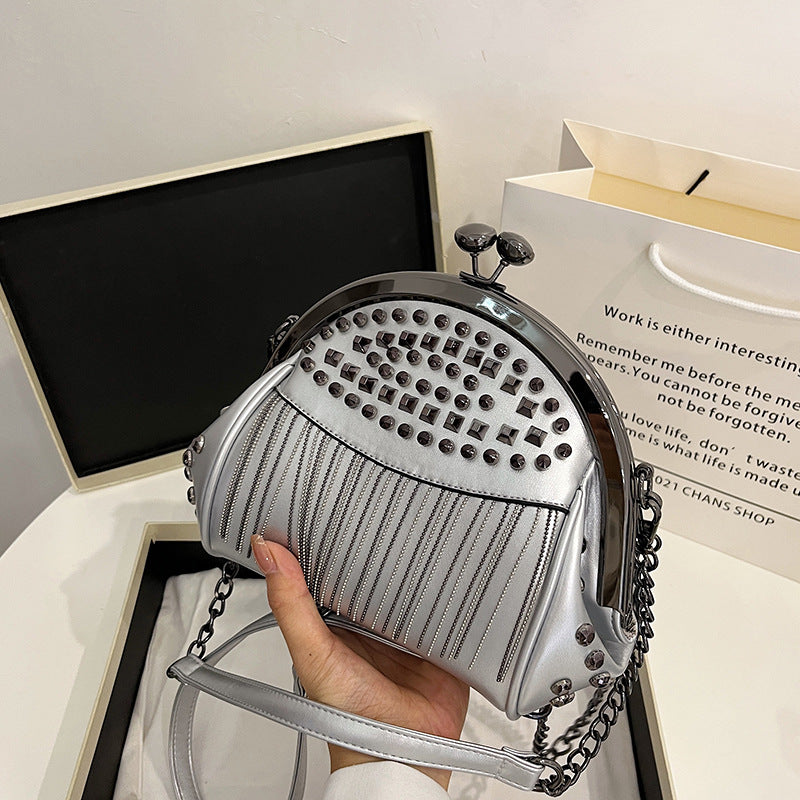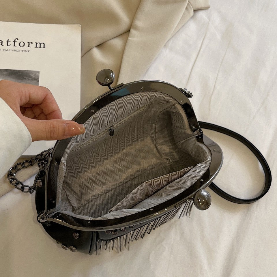 Kadınlar için öpücük tokalı, metal çivili ve dekoratif püsküllü çanta