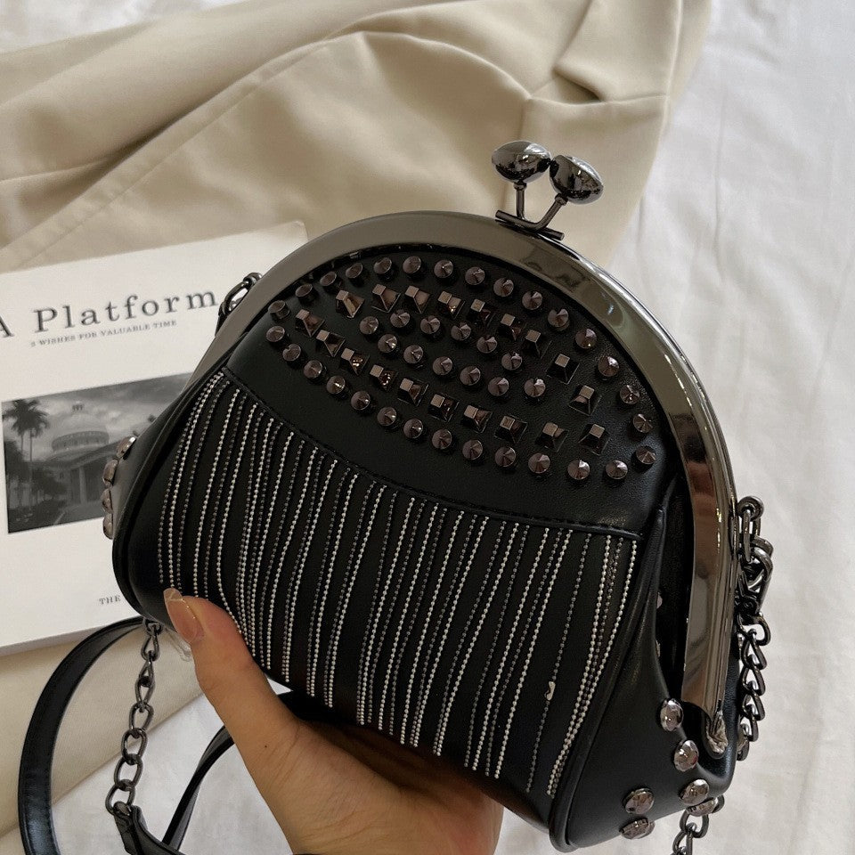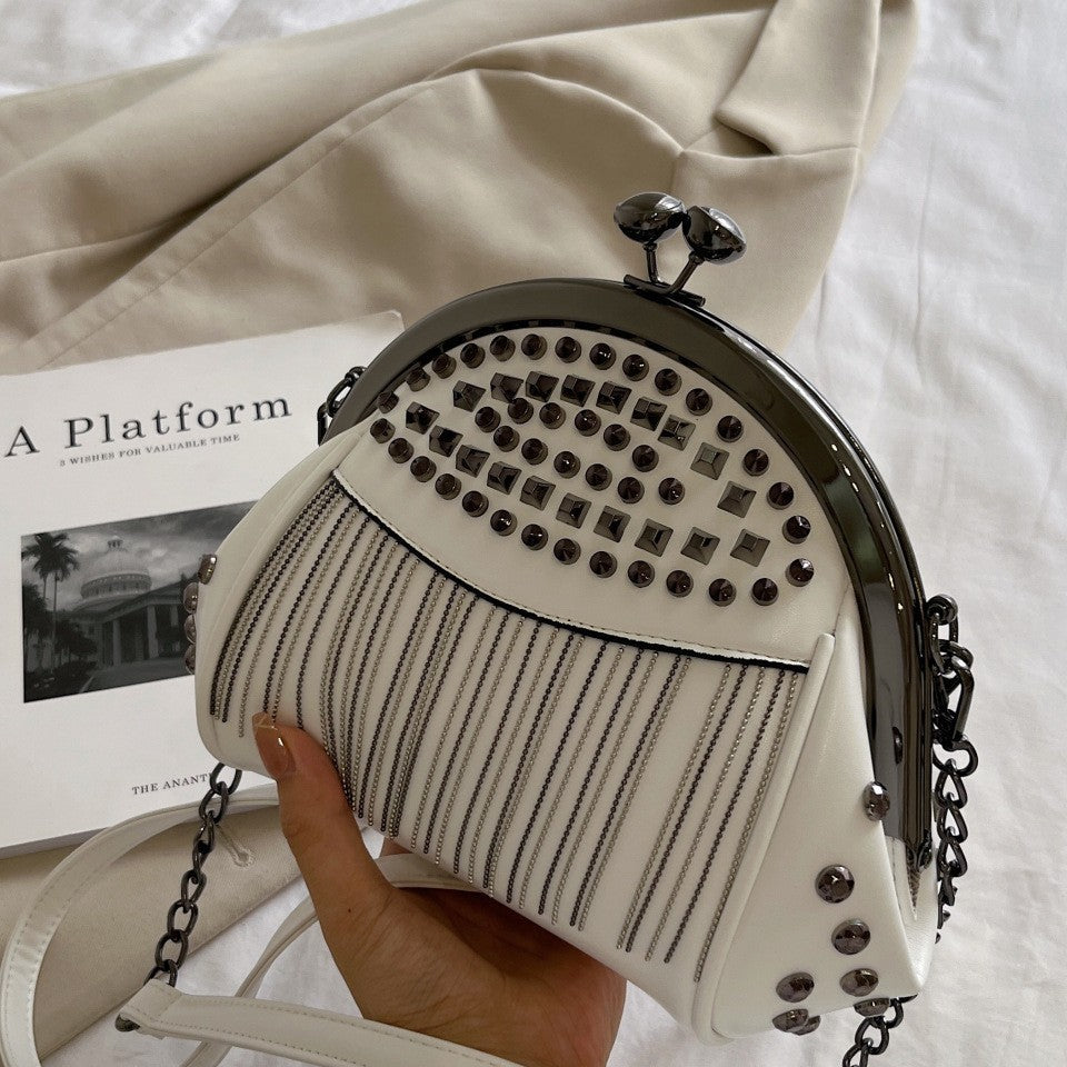 Zarif ve asi dokunuşu bir arada taşıyan bu çanta, her tarz kadının gardırobunda yerini hak ediyor. Öpücük tokalı kapanışıyla romantik bir hava sunarken, metal çiviler ve dekoratif püsküller modern bir duruş kazandırıyor. Günlük kullanımdan akşam davetlerine kadar her anında şıklığını tamamlar.
