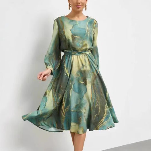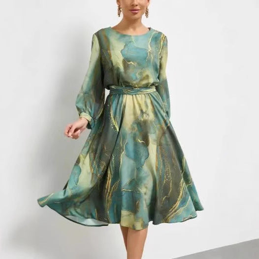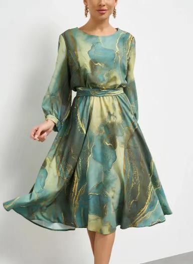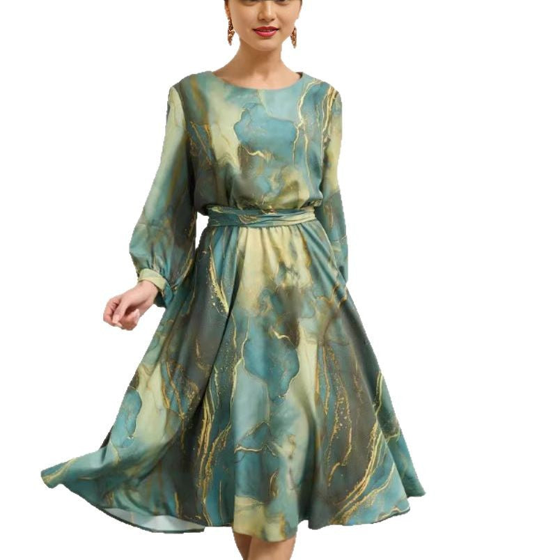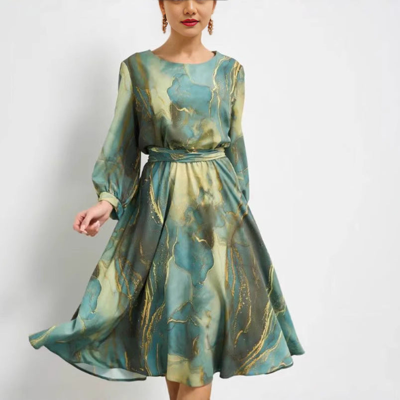 2025 Yeni Baskılı Belden Oturan Fransız Uzun Kollu Elbise
