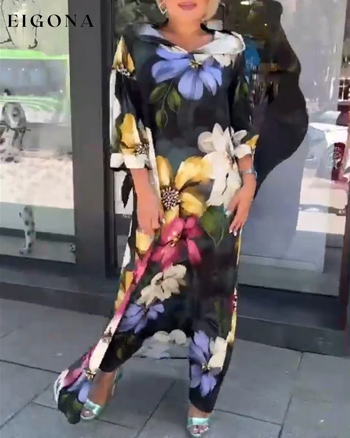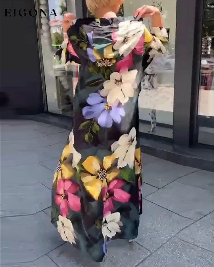 2026 sezonu için çiçek desenli ve üç çeyrek kollu kadın elbisesi.