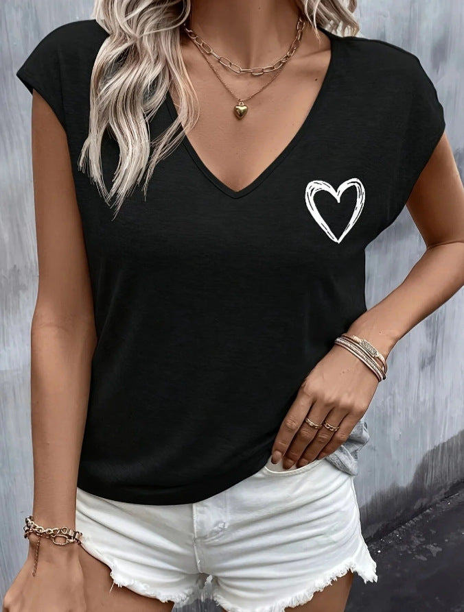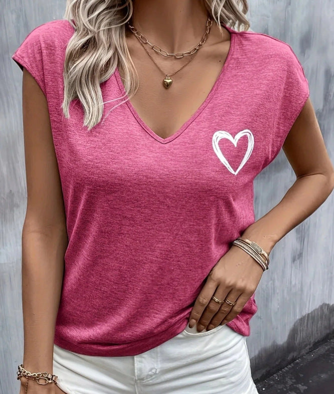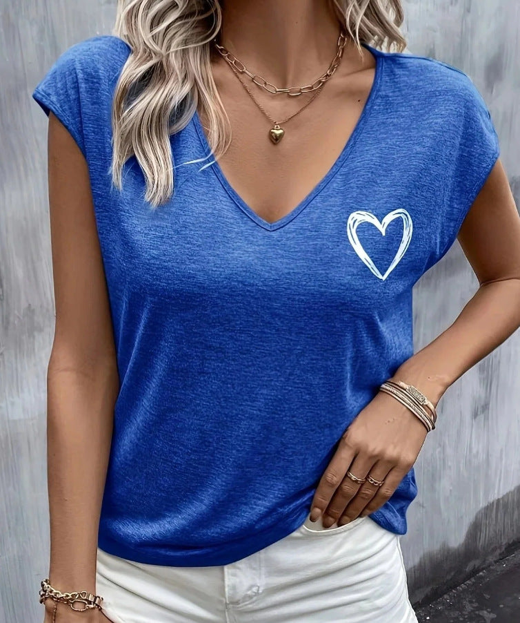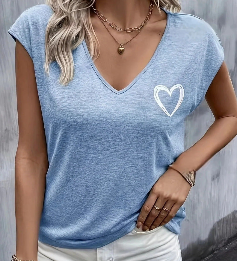 Romantik kalp deseni ve zarif tüylü kol detaylarıyla bu yazlık tişört, şıklığına eğlenceli bir dokunuş katmak isteyen kadınlar için tasarlandı. Hafif ve nefes alabilen kumaşı sayesinde sıcak günlerde konfor sunarken, özgün tasarımıyla her ortamda fark yaratır.