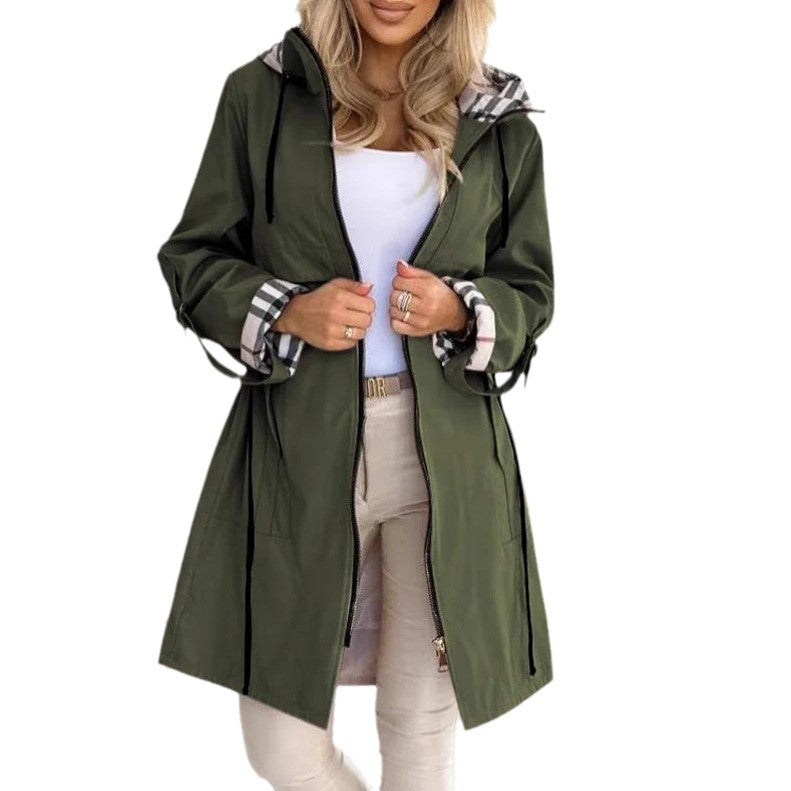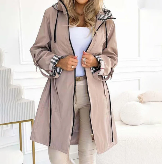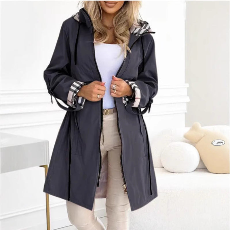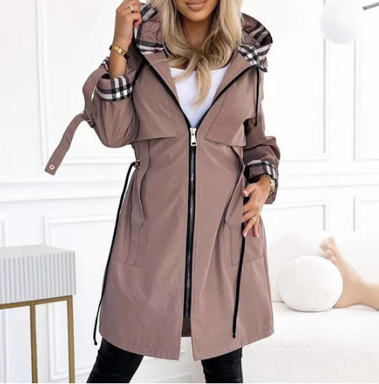 Kapüşonlu, bağcıklı bel ve fermuarlı uzun ceket